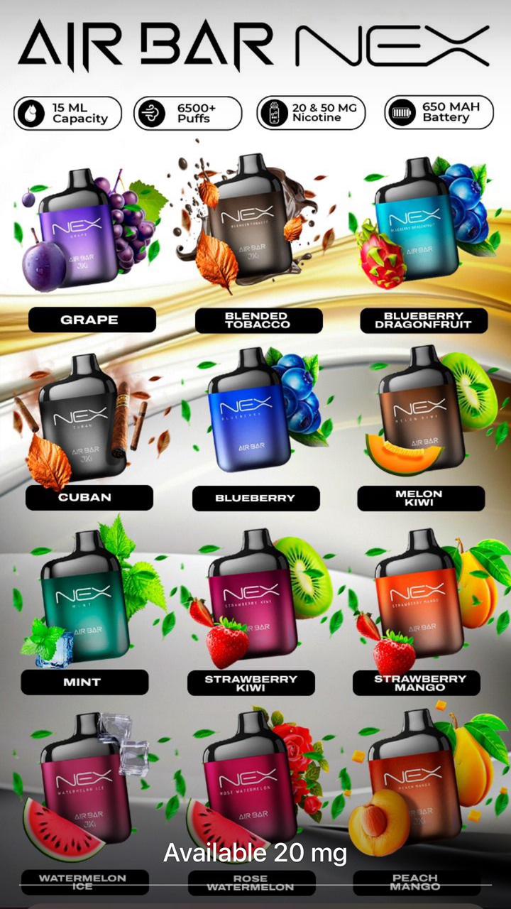 Unleash an exceptional vaping experience with the Air Bar Nex 6500 Puffs Disposable Vape! This device is crafted for flavor, durability, and ease, boasting up to 6500 puffs of rich, consistent flavor. Pre-filled with 15ml of e-liquid and featuring a compact 650mAh battery, it’s ideal for vapers who want longevity and smooth performance in every puff. Designed to be leak-proof and featuring 5% nicotine strength, each flavor delivers a perfect balance of boldness and smoothness. With multiple safety features, the Air Bar Nex 6500 is the ultimate vaping companion, ready to deliver whenever and wherever you are.
