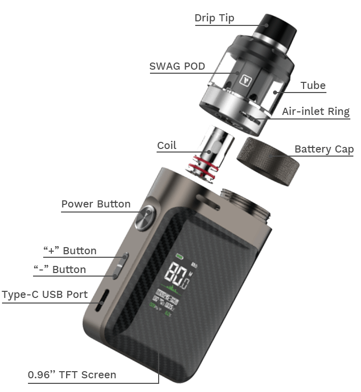 The Vaporesso Swag PX80 is a redesign of the classic Swag vape kit and comes highly recommended for intermediate and advanced vapers. Capable of an 80W max output this kit has been designed to support DTL (Direct To Lung) vaping, while the power supplied by the 18650 battery (sold separately) offers up to a full day of vaping. Each kit comes complete with the PX80 pod tank that holds 2ml of eliquid and is compatible with the GTX coil range (two are included).